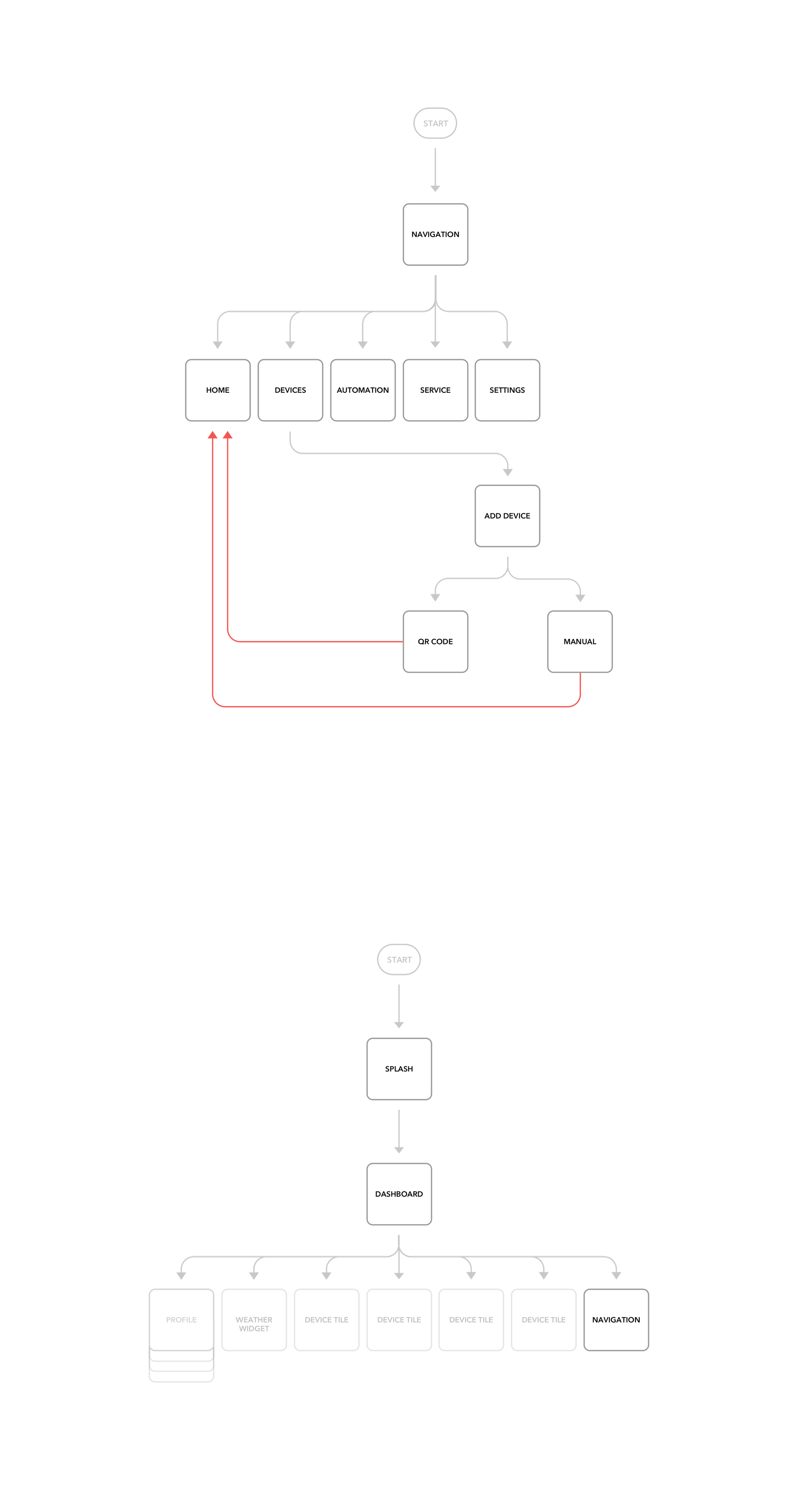 We've created user flow diagrams to map every step of the users interaction required to achieve the main goal of this app: "As a user, I want to have a remote control of my home devices!”